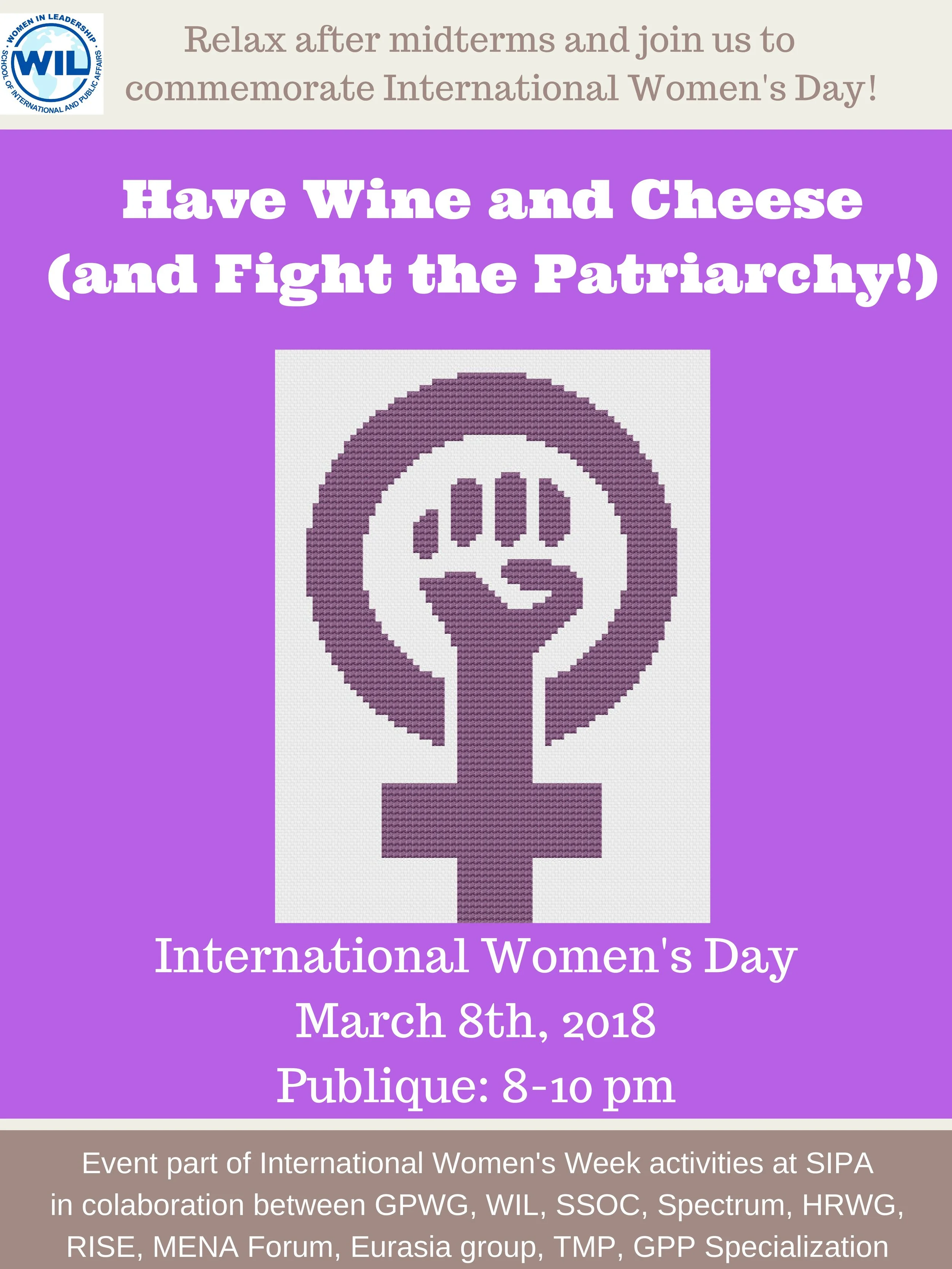 For more information and up-to-date notifications on times and locations, check out the Facebook event International Women's Week at SIPA.