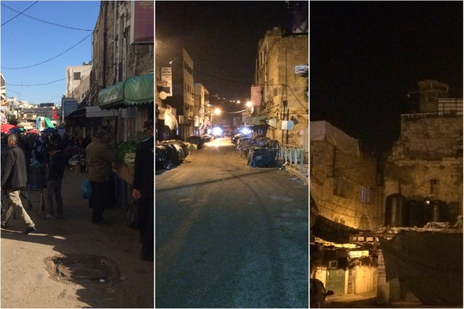 Three pictures of the main Palestinian street in the Old City of Al-Khalil in 2015. Left: During the day, the city is vibrant with life as shops open and people come to buy and sell goods. Middle: At night, the shops are closed and the Old City becomes a ghost town. Most Palestinian families who lived in the Old City have left due to the oppression they feel from the IDF and settlers. Those who remain rarely go outside at night due to IDF patrols. Right: One of several outposts perched on top of buildings along the main street. At night, there is a constant sense of being watched on these streets. Photos by Michael Thomson