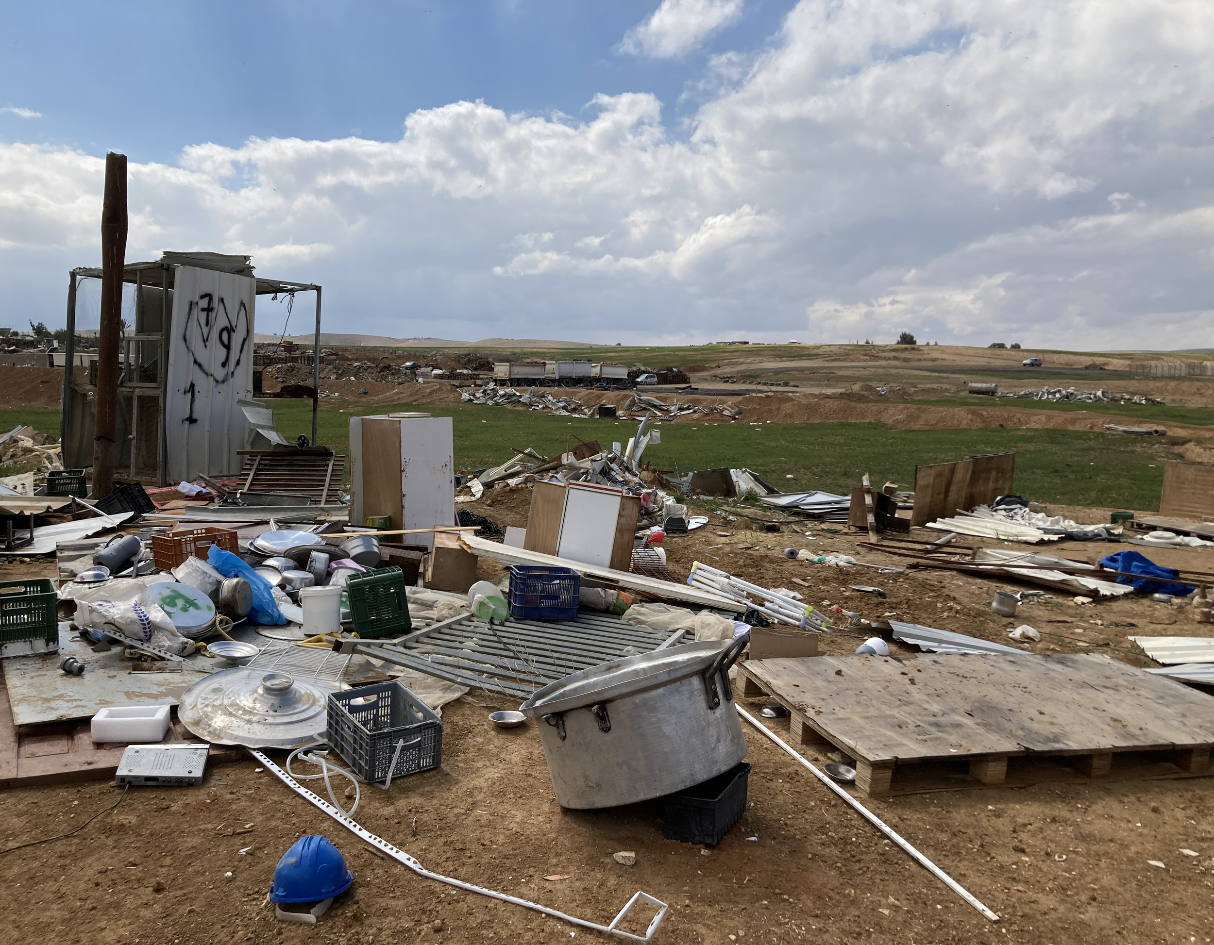 Pots, pans, and household items are left behind from a demolished Bedouin home in the Negev-Naqab desert in March 2022. Photo by Ryan Lee