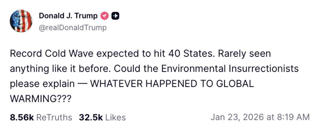 The current federal administration continues to express skepticism about climate change, even as scientific evidence in favor of it grows stronger. Recent federal actions reflect this stance, including the revocation of the 2009 endangerment finding that underpins key emissions regulations. Following what amounts to one of the most aggressive rollbacks of environmental regulations to date, the second Trump administration has cited recent extreme cold events to cast doubt on the reality of global warming. In January 2026, President Trump posted on Truth Social: “Record cold wave expected to hit 40 states… Could the environmental insurrectionists please explain — WHATEVER HAPPENED TO GLOBAL WARMING???”